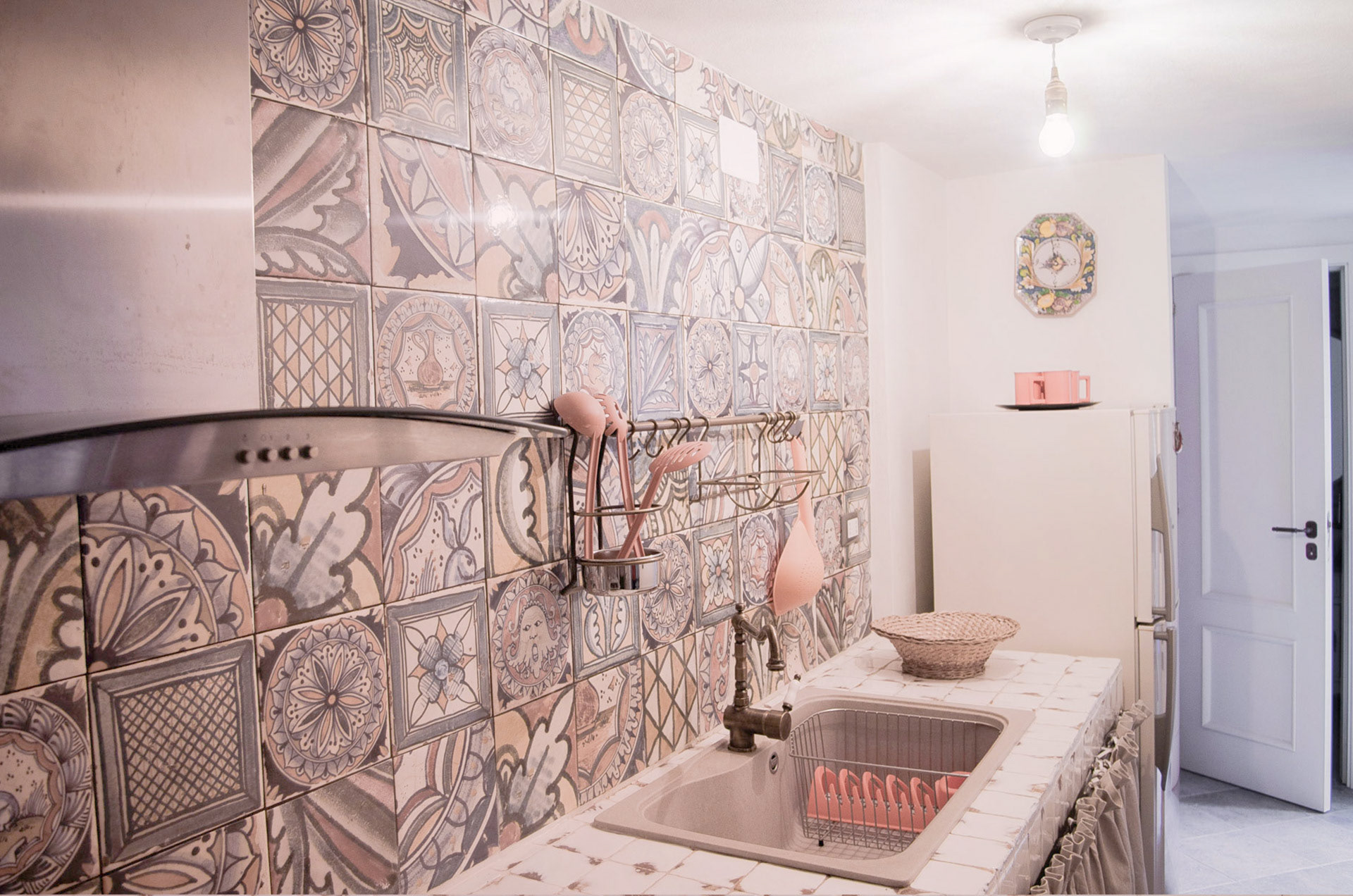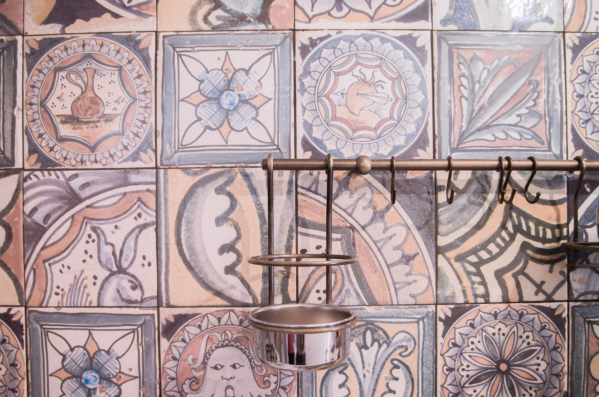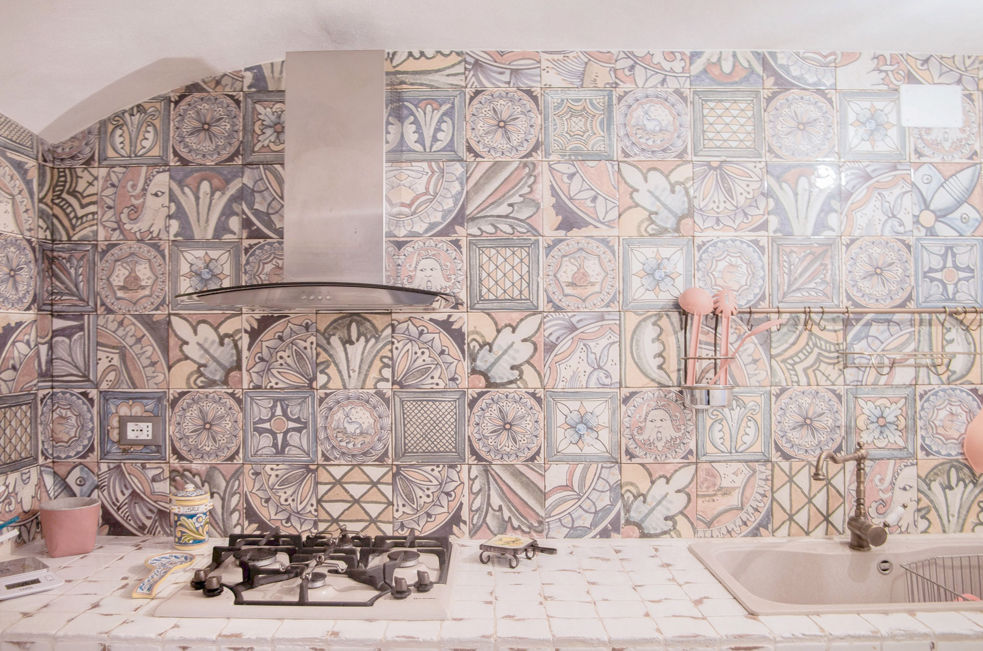 The colourful Mediterranean-style tiles make the kitchen unique. The dried palm leaves that frame the beds of the loft area add an exotic and refined touch, and the wrought iron ornamental motifs recall the crisp waves of the sea. The walls of this house are made of white lava stone and the light that reflects on the nearby sea lightly shines on the elegant Shabby Chic interiors.